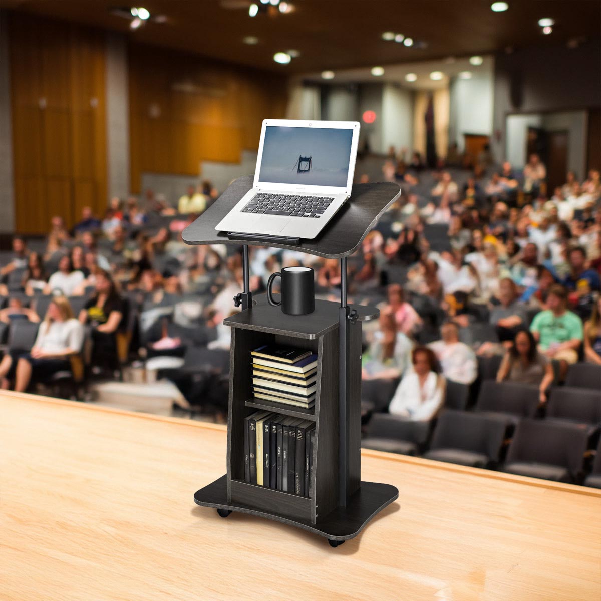 This height-adjustable mobile standing desk can raise and lower your work surface quickly and effortlessly, thus making the work more comfortable. It is very suitable for use as a laptop workstation in offices, school, college, home, showrooms, classrooms and presentation.