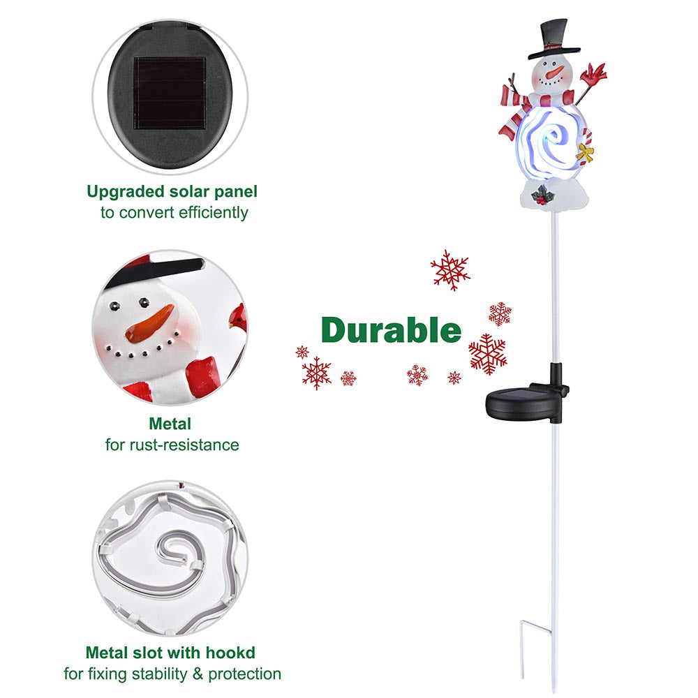 - 2 pcs 5"x4"x33"Santa Solar Stake Lights feature Christmas tree & red berry design, with red LED light in the central and Snowman Solar Stake Lights with blue LED light in the central to create a beautiful scenario at night & enhance festival atmosphere, fit your garden, backyard, lawn, pathway, patio, etc., perfect for Christmas, wedding, party decoration