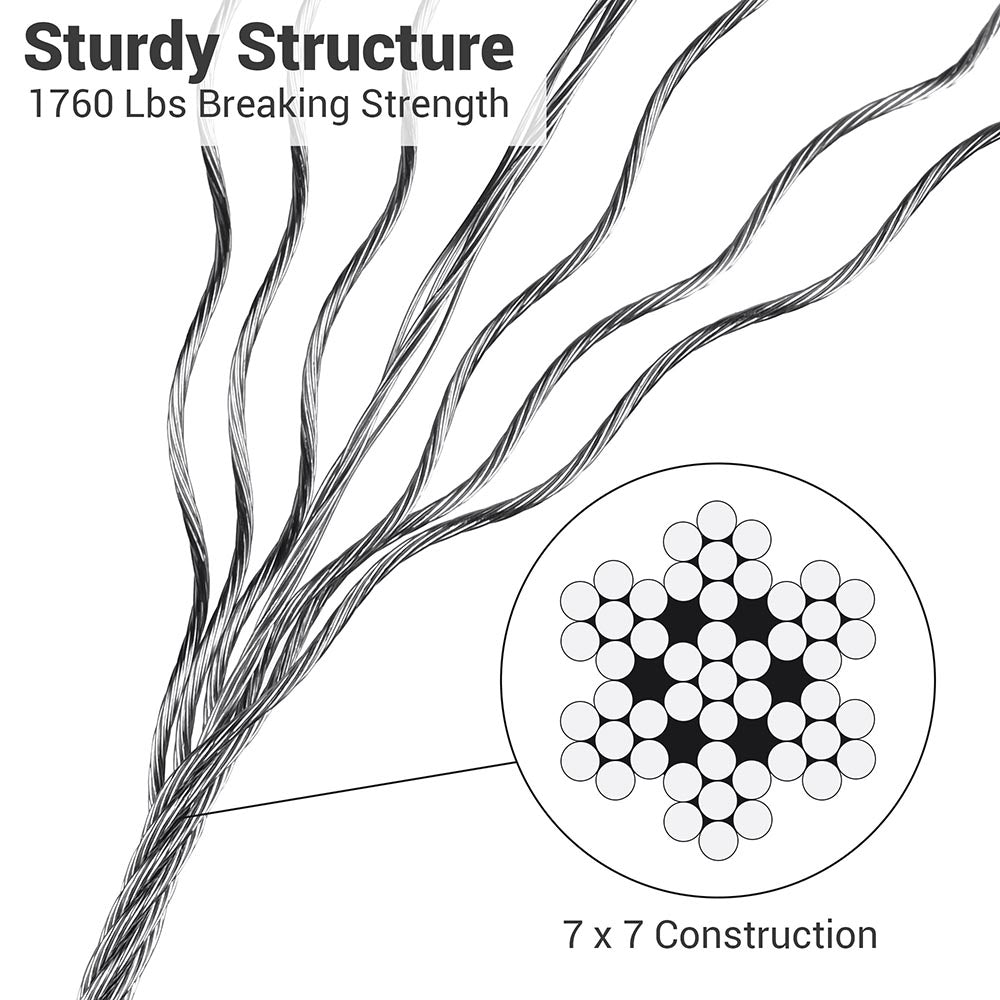 - Sturdy Structure - 7x7 construction with 7 groups of 7 strands braided together to form the cable, which provides good strength, high flexibility and abrasion resistance with up to 1760 Lbs breaking strength, durable for daily use
