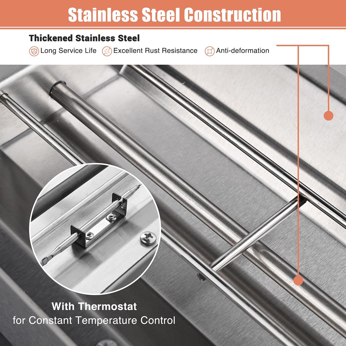 - 29 1/2" long and 1000W high-powered heating tube for fast heating and offering large heating area to keep the food at optimum temperature, suitable for nuggets, chips, soup, fried chicken, burgers, etc.