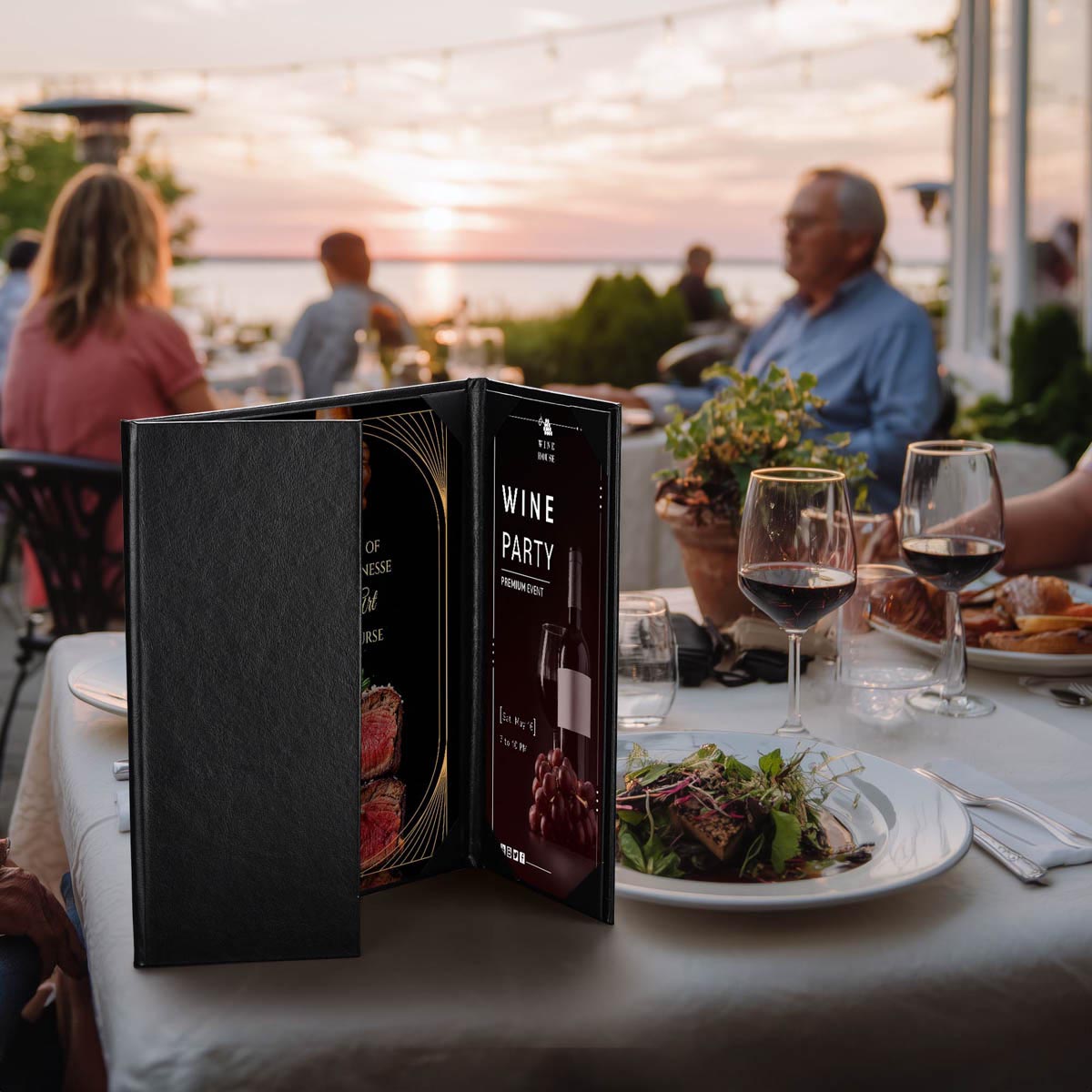 - Book & Half and Gate-view Options hold your full 8.5"x11" menu and 4.25"x11" half-page for wine lists together in one organized cover
