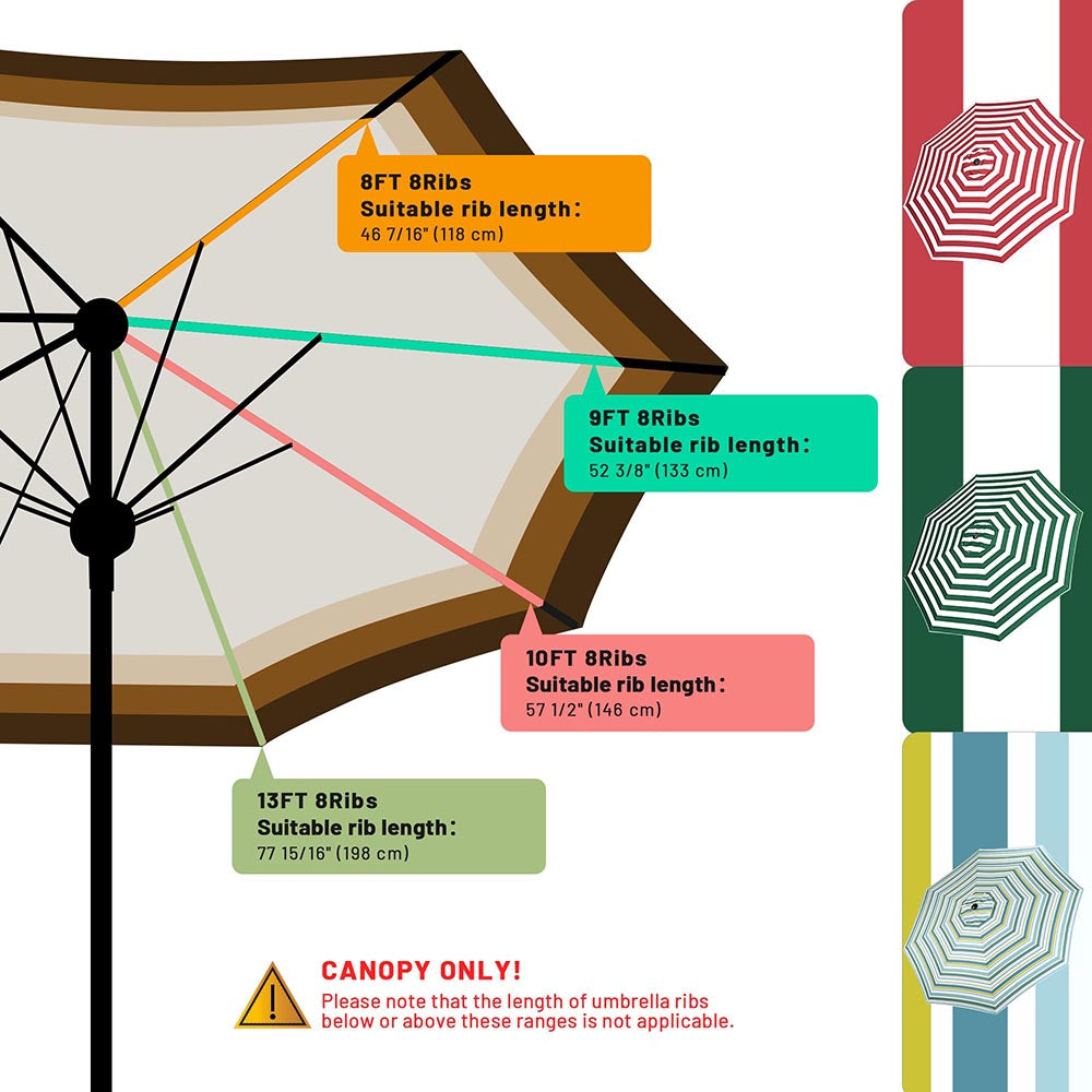 - Fits For Most 9 Feet Diam. Umbrella, 8 Ribs Construction with each rib's length: 4 5/12 ft to 4 1/2 ft (134 to 136 cm)