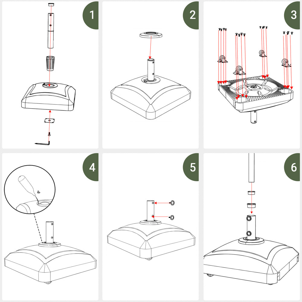 - Just secure the umbrella holder onto the base, installing 4 wheels, filling the base with water or sand, and finally inserting the umbrella and fastening the knobs
