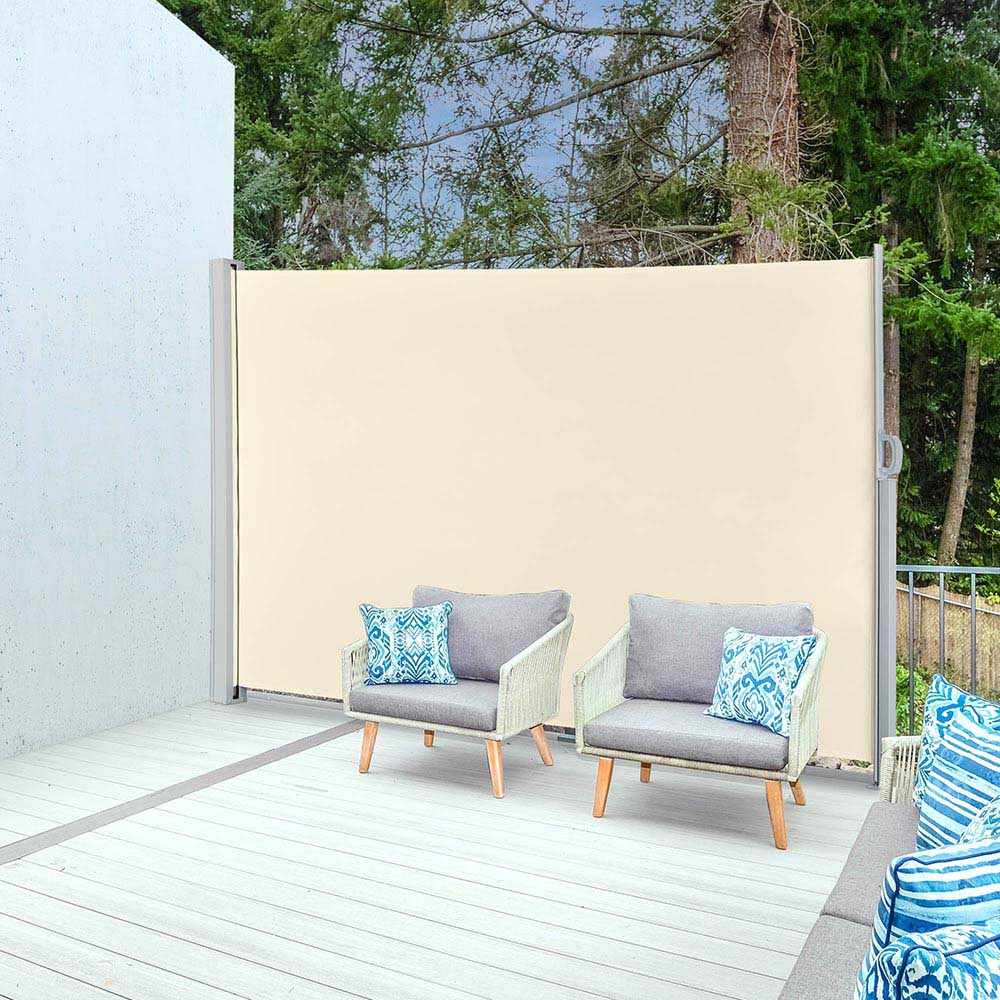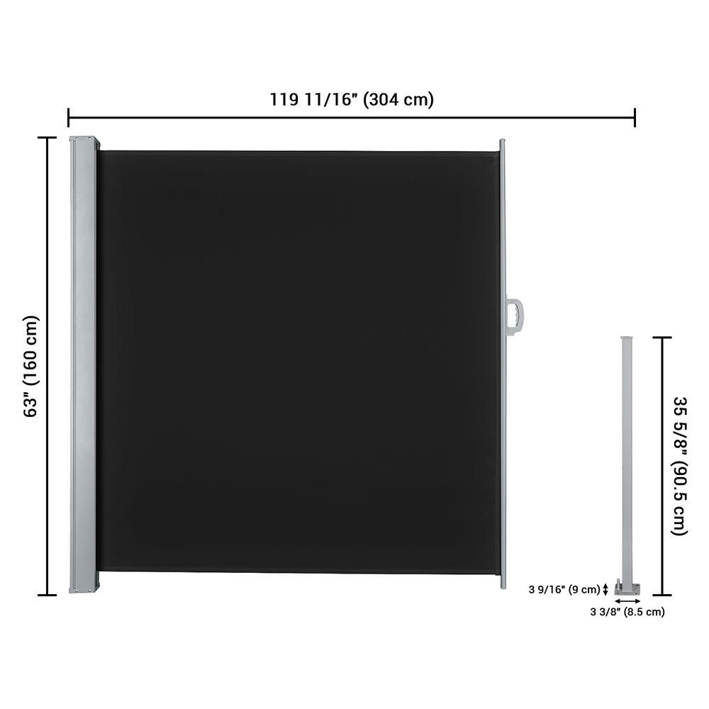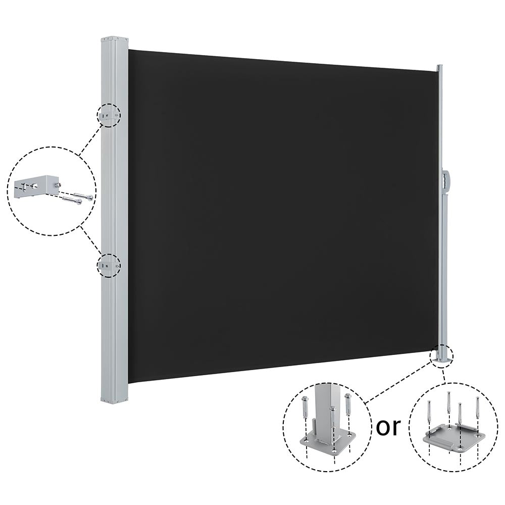 Approx. 5.2'Hx9.9'L Outdoor Side Screen Awning Sun Shade Porch Wind Blocker is made of 220gsm polyester fabric with UV50+ protection, tear resistant and water repellent. It can block wind, sunlight and protect privacy. Comes with mounting accessories for secure installation. Suitable for indoors like office, studio, gallery or dressing room, or outdoors like terrace, garden, patio, pool and so on.